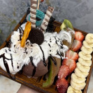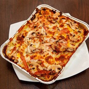 سیب زمینی سرخ شده ، ژامبون گوشت ۹۰ درصد، پپرونی ، قارچ ، پنیر، ادویه مخصوص