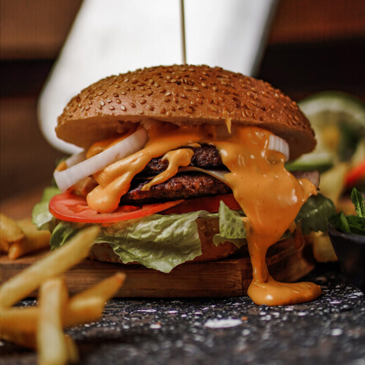 برگر ۹۰ درصد ، سالاد ، سس آلفردو، نان فرانسوی گرد